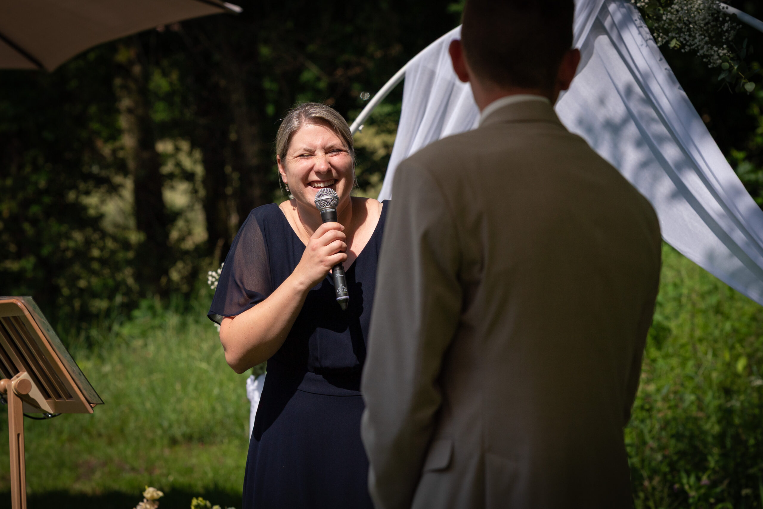 Und nun, ein paar Tage nach der Trauung sind wir so froh, Katha an unserer Seite gehabt zu haben. Katha ist einfach ein Ruhepol am Tag der Hochzeit. Sie hat uns im ganzen Prozess immer ein gutes Gefühl gegeben und hat sich ganz auf unsere Bedürfnisse eingestellt und uns gut beraten, wie wir die Trauung auch mit Baby am entspanntesten für uns machen können. Die Traurede, die sie für uns gehalten hat, war perfekt auf uns abgestimmt. Es gab zahlreiche Lacher und auch ein paar Tränchen.